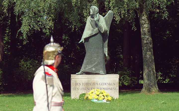 Ein Schütze passiert das Gefallenen-Denkmal.