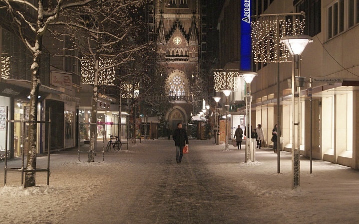 Weihnachtsstimmung auf der Rheinstraße, im Hintergrund St. Dionysius