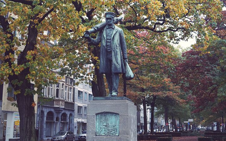 Das Seidenweber-Denkmal am Südwall, eine Darstellung von 'Meister Ponzelar' mit Kettbaum und Garnrollensack