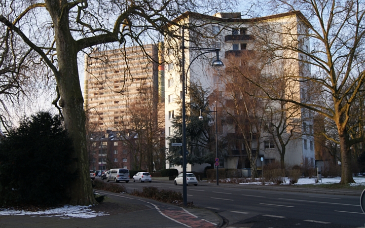 Blick von der Leyentalstraße auf die Hochhausarchitektur verschiedener Jahrzehnte