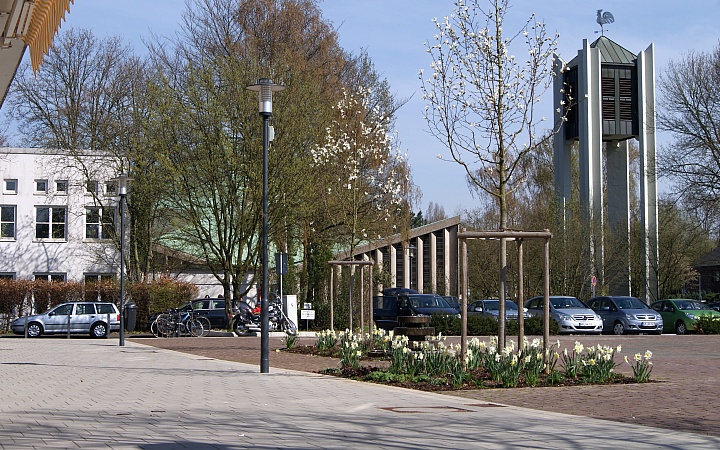 Blick vom Insterburger Platz auf die Zeltkirche St. Pius, Gartenstadt