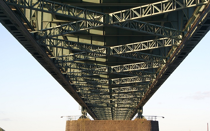 Die 860 m lange Uerdinger Rheinbrücke von unten gesehen