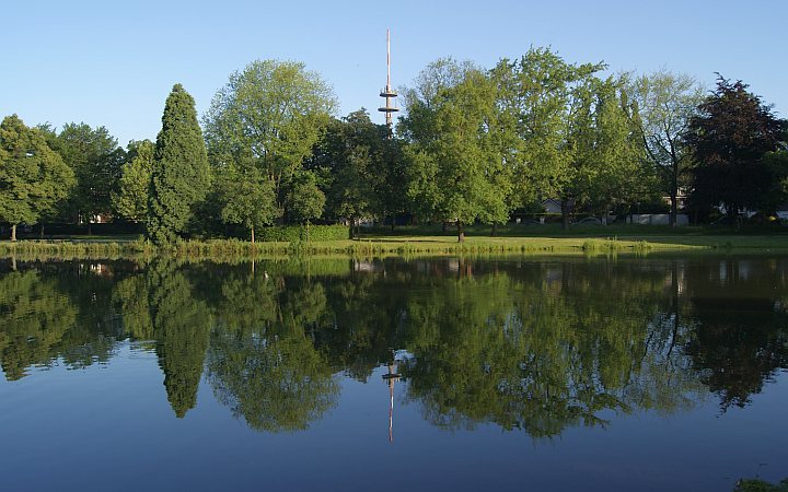 Der 103 m hohe Fernmeldeturm spiegelt sich im Schönwasserweiher.